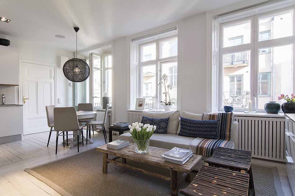 The first interior you are likely to observe upon entering this apartment is the bedroom, creatively separated from the rest of the project through glass walls. Pebbles under the bed, a giant mirror and framed graphics contribute to the Scandinavian personality of this space. The living zone, kitchen and dining table are organized in an open layout. And when it comes to Scandinavian apartments, an irresistible terrace is a must. In this case, the small balcony extends living spaces, creating a charming venue for having coffee and breakfast during warm summer mornings.